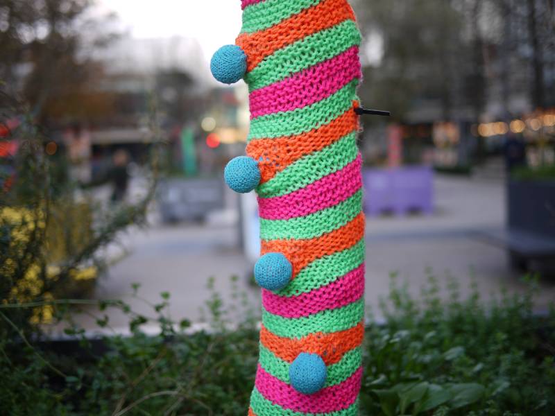Techniques such as numerical art have been utilised; look out for lucky numbers such as 7 and 8, and the numbers 12 and 20, significant to the local area. The knitted art looks to draw upon our seasonal sensibilities and act as a source of warmth and joy.